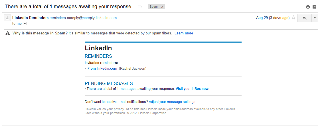 LinkedIn Spammer Published 2012/09/01 at 1115 × 450 in Spammers learn new tricks… Next → What the spam looks like Share this:TweetLike Loading...