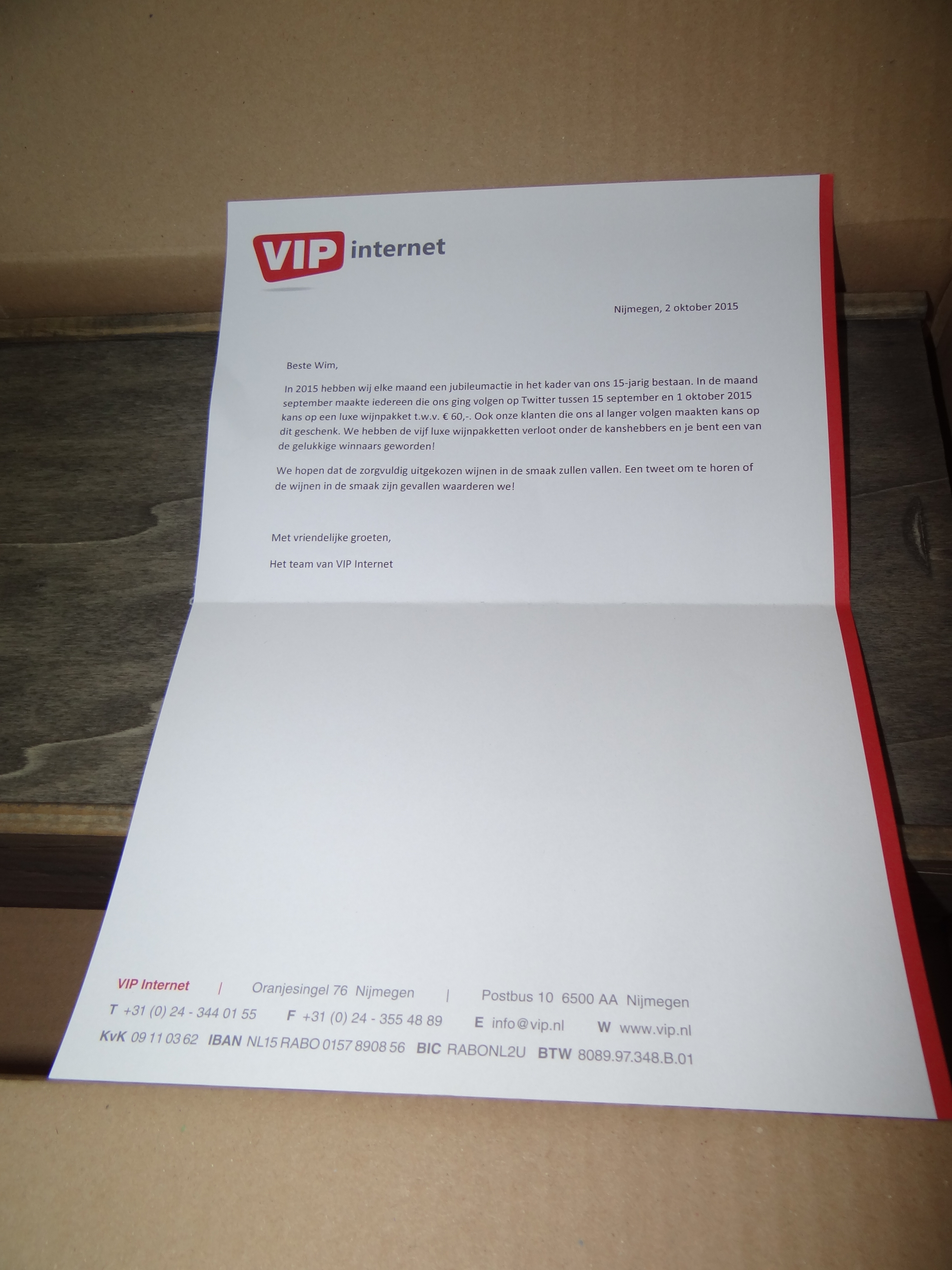 De afzender is VIP Internet waar ik diverse domeinnamen heb geregistreerd waaronder de naam van mijn blog. Jeweetwel, wat je nu leest. VIP bestaat dit jaar namelijk 15 jaar en dat wilden ze vieren dus hebben ze een aantal pakketten verloot aan hun Twitter-volgers. Ik volg ze op Twitter dus ik had een kans. En ik won!