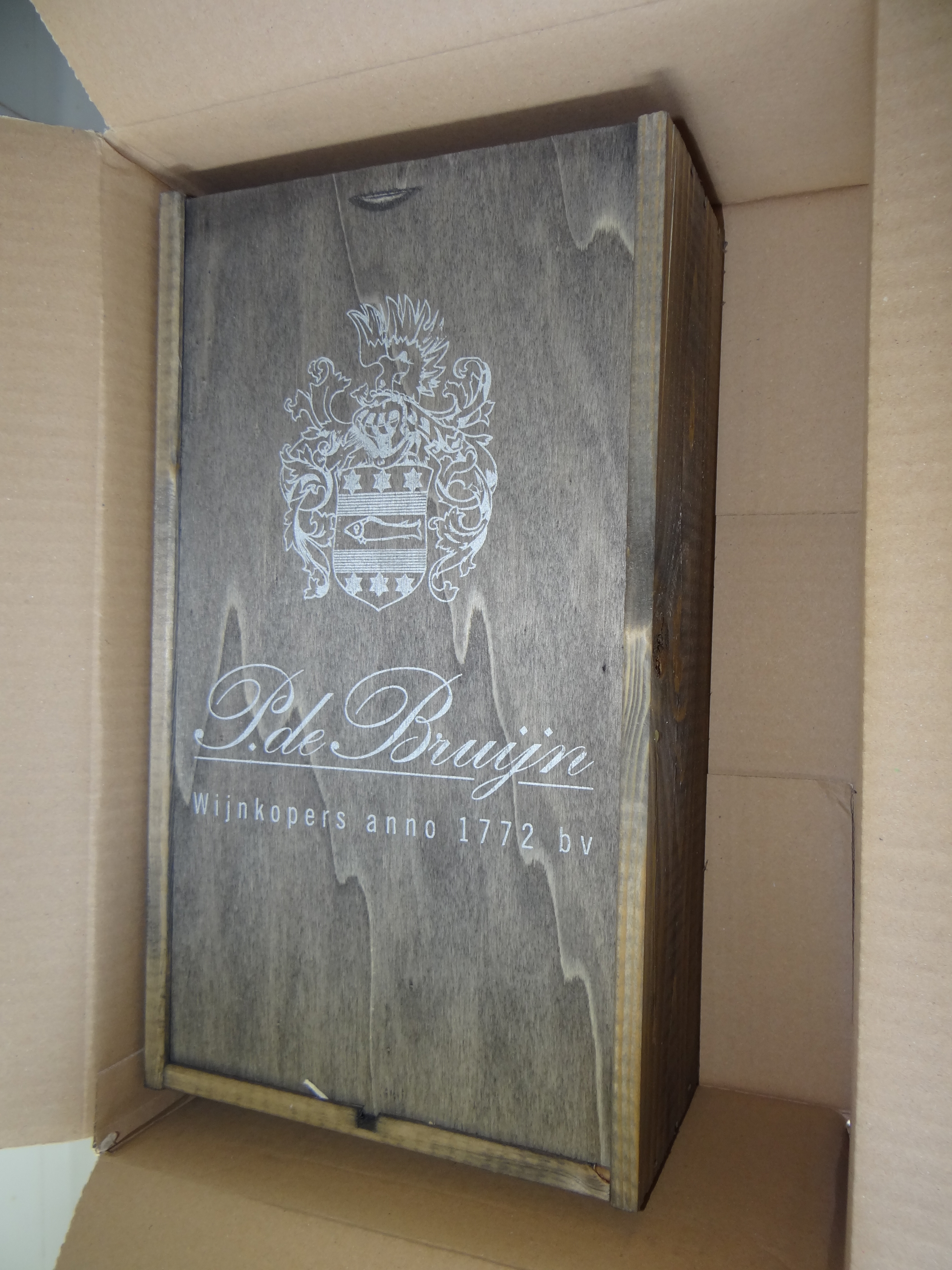 En dan de wijnkist. Hierboven de kist nog in de doos, en hieronder buiten de doos. Een mooie kist, overigens.