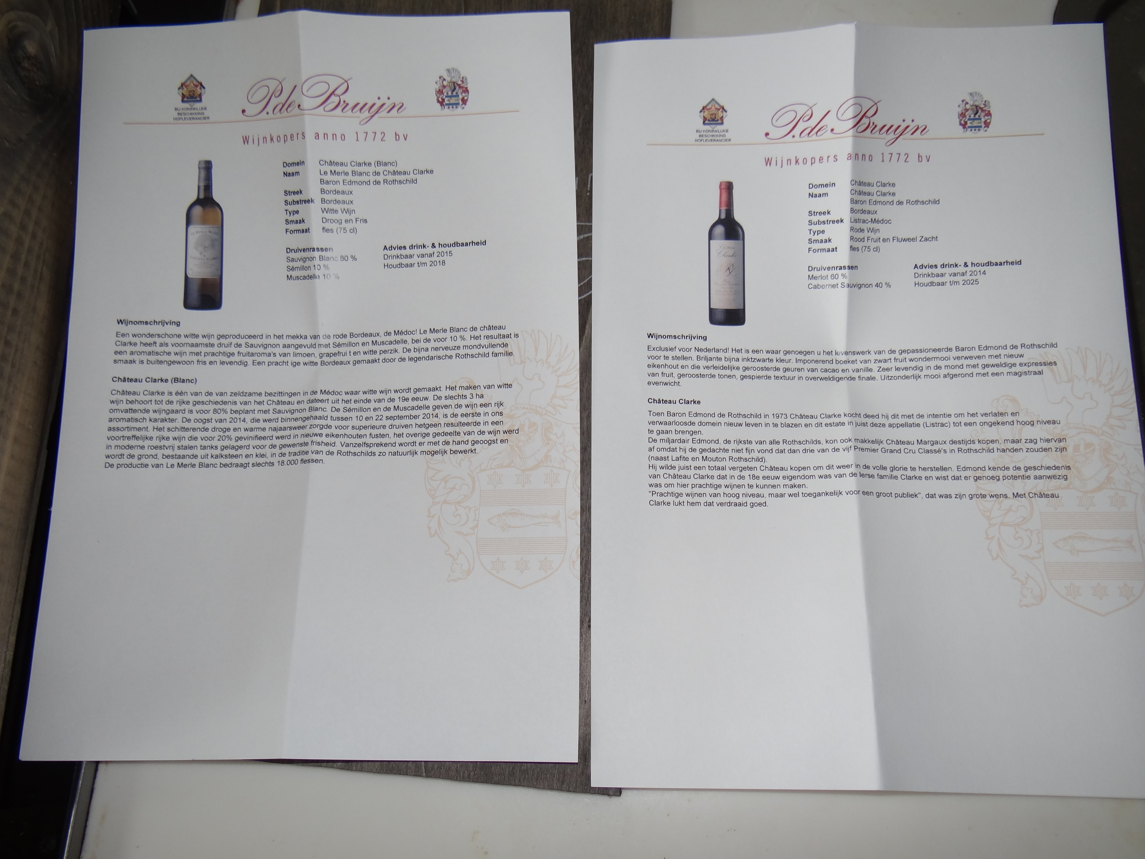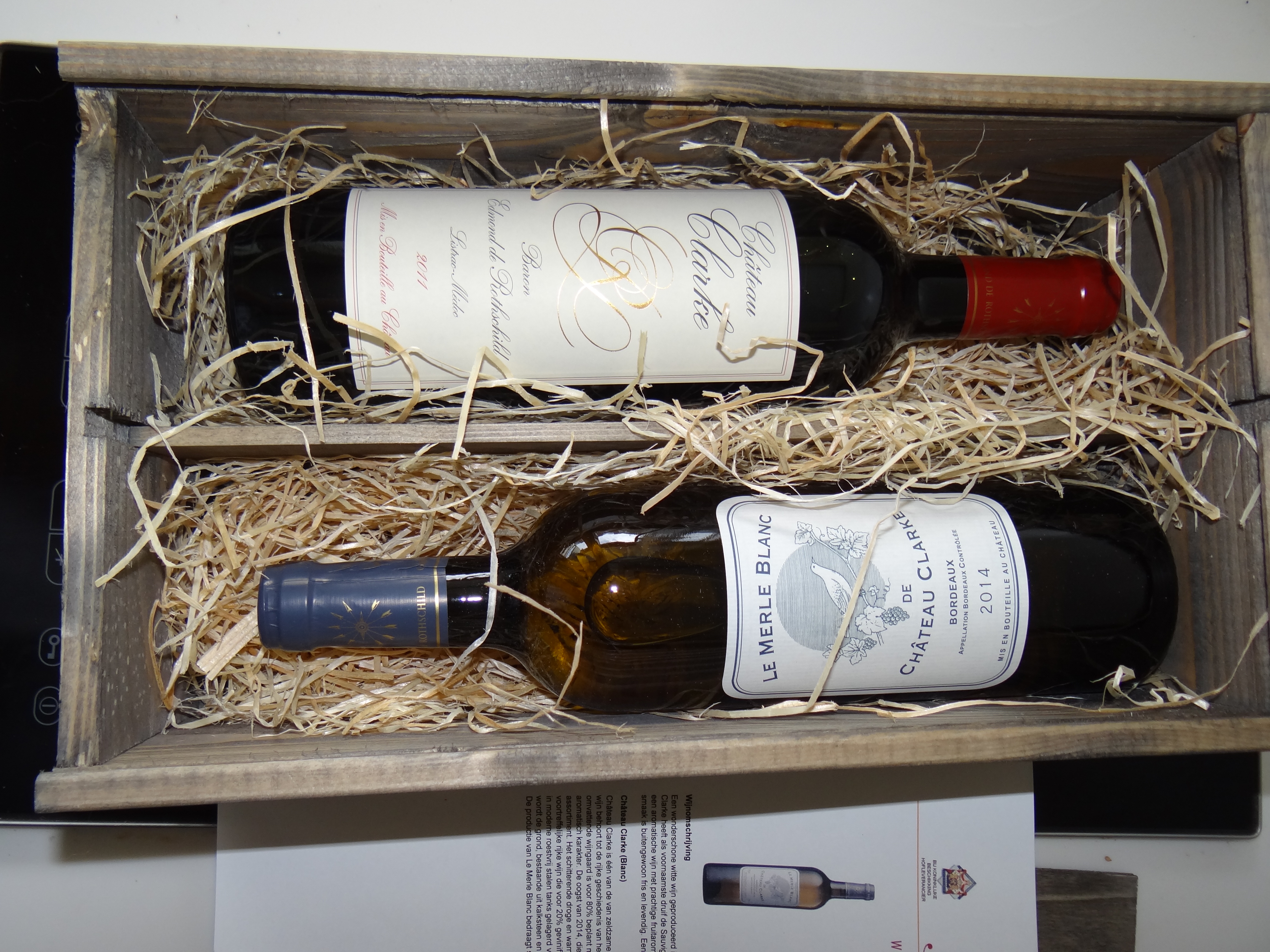Er zitten twee wijnflessen in. Een witte Merle Blanc de Chateau Clarke en is vanaf 2015 drinkbaar en houdbaar tot 2018. Ik denk dat dit een mooie fles is om met de Kerstdagen aan te breken.