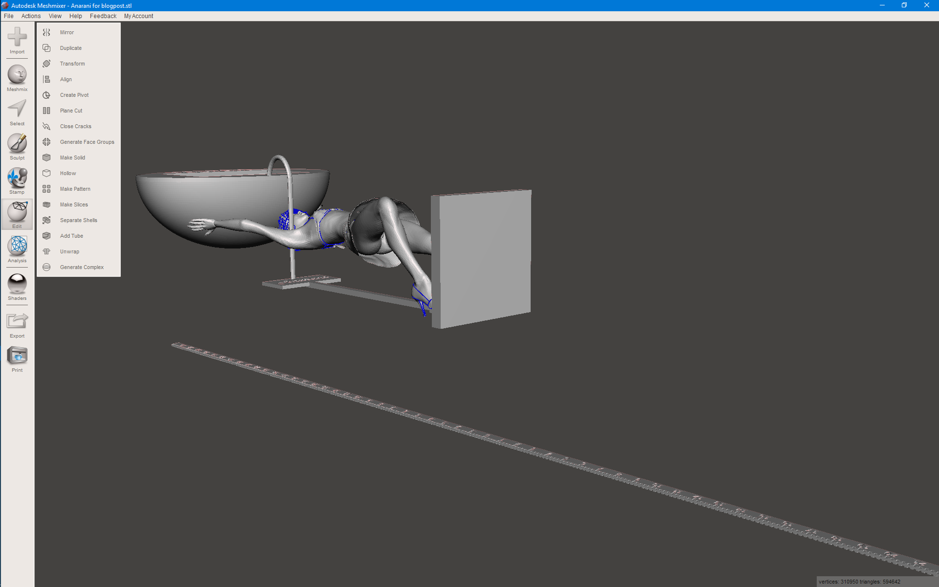 Now, that is a minor annoyance. I will need to rotate and resize it first. I choose ‘Edit/Transform’ and do a ‘Rotate X’ for 90 degrees and put ‘Size Z’ to 600 mm which is the exact length of the ruler. Once it has the proper scale, I export the file to the folder 4 and import it again, replacing the current object in MeshMixer. I need to do this because MeshMixer gets a bit confused after resizing and the model looks ugly in the view. There’s nothing wrong with the model, though. It’s just MeshMixer having a bad render engine.