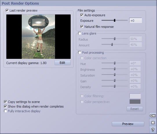 Next, I check the materials that are provided by Poser. The dress, for example, has a zipper which uses a reflection map. I hate those, because Vue does a full 360-degree view of everything if I want to. Reflection maps are a poor alternative for real reflections.