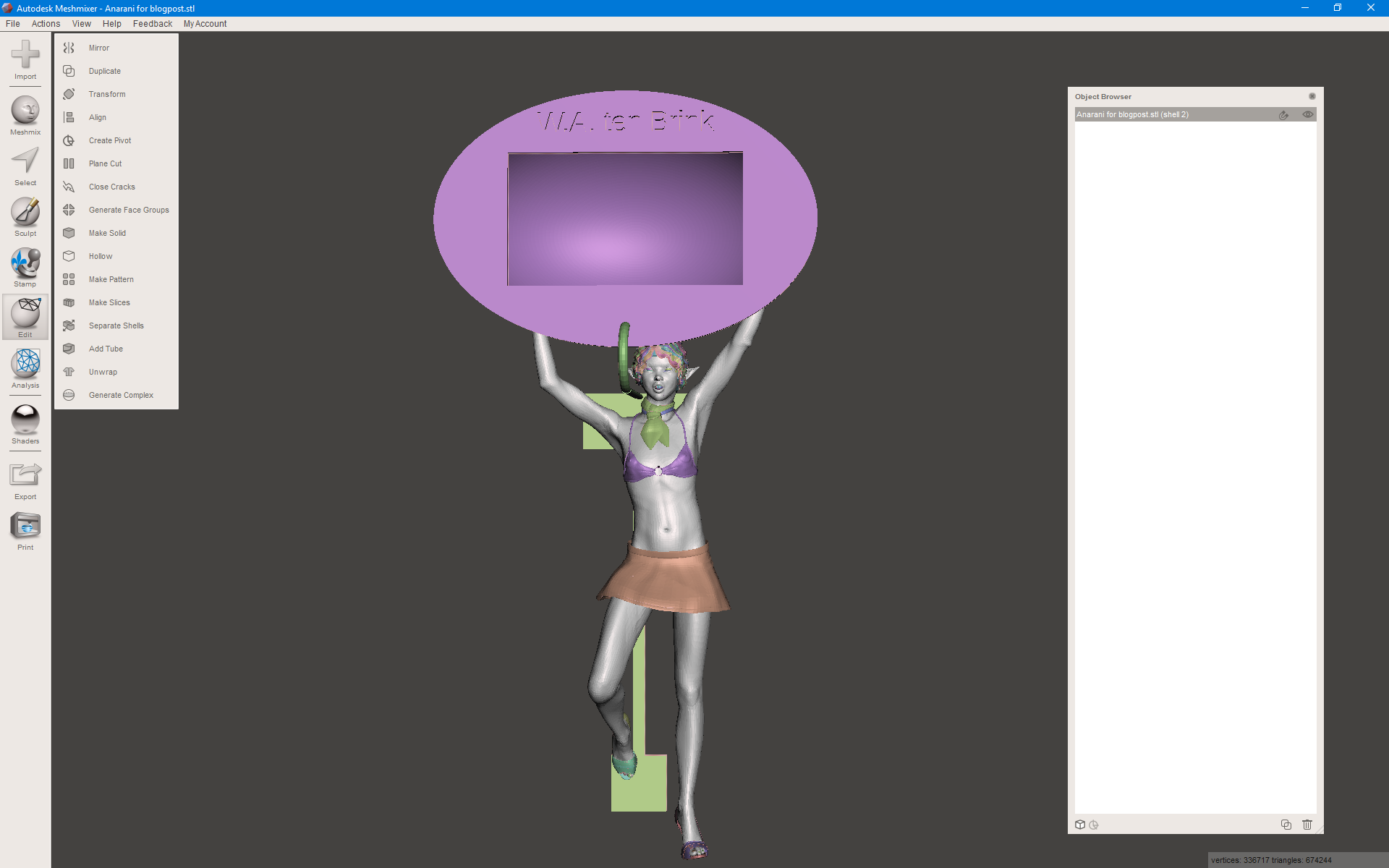 Her shoes have small flowers and petals, which could become loose shells in Shapeway so those are also removed. Then choose “Merge Select” from the bottom buttons to merge all parts that you have selected. This makes one part from all of those parts. And at this point you can save the file as a StereoLithography .stl file in binary to continue processing in the next step. This export file will be in my 3rd folder.