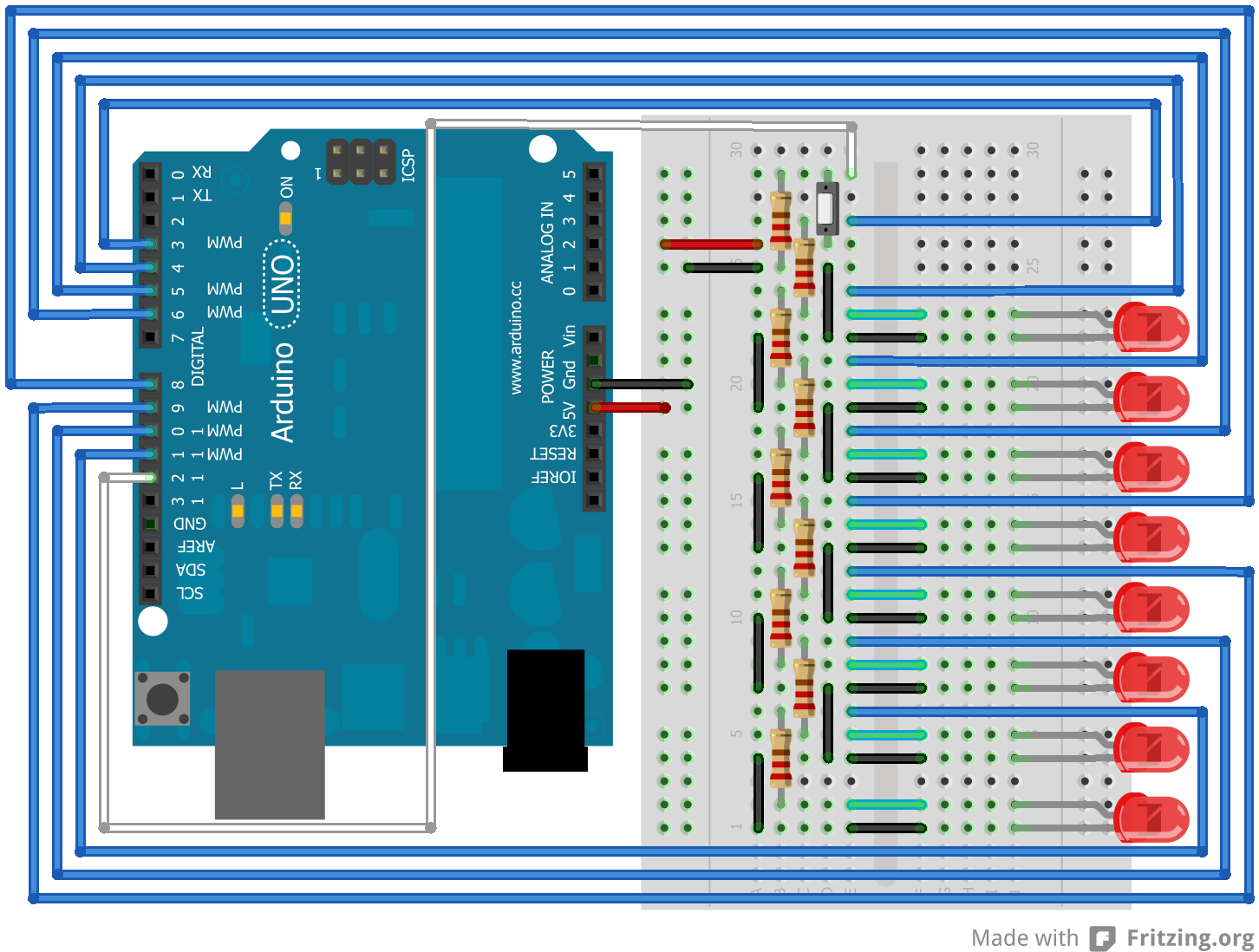 The setup() function is also a simple one, but I want to show the dice are working during start-up. That’s why I loop through all possible combinations before displaying snake-eyes.